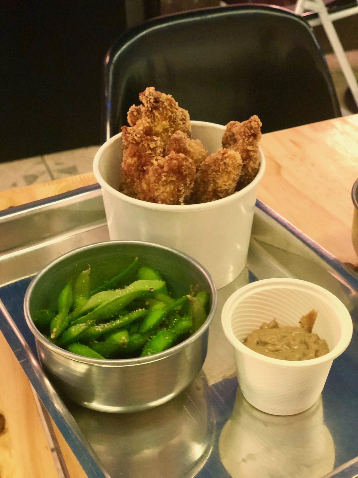 Porções de frango frito com molho tonkatsu e edamame. Esse frango frito ganhou nosso coração! <3