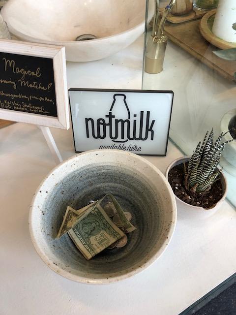 Pedi um latte de matchá ($ 8) feito com leite de amêndoas, que segundo a atendente, seria o leite vegetal mais semelhante ao leite de vaca convencional. Delicioso e absolutamente reconfortante.