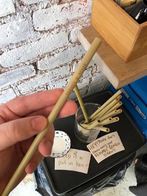 Outra coisa que me chamou atenção foi a substituição dos já obsoletos canudos de plástico nas bebidas geladas por canudos feitos de bambu, que você pode tanto devolver quanto levar para casa.