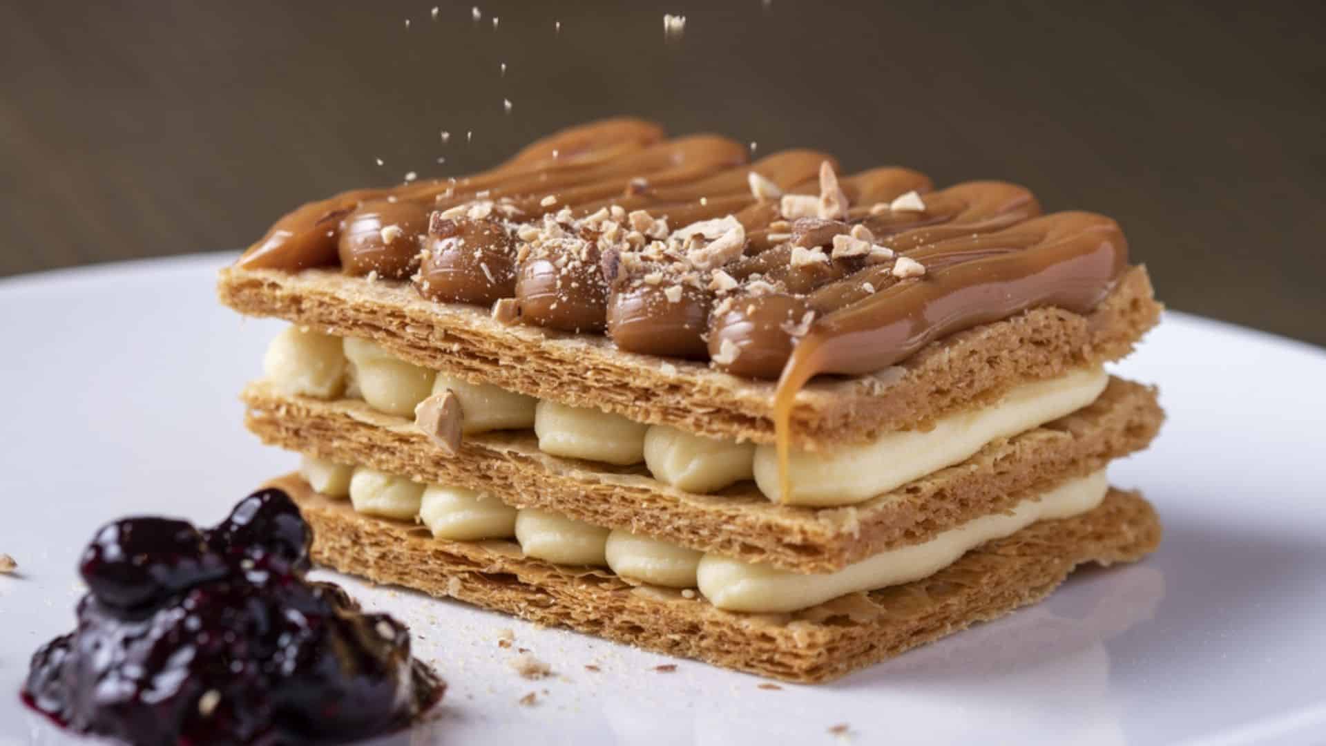 O clássico Mil Folhas de doce de leite com avelãs e creme de baunilha (R$ 38) do Pateo do Palácio, novo restaurante ao ar livre do hotel Palácio Tangará, localizado no Panamby, é a sobremesa ideal para os apaixonados por doces. Com assinatura dos renomados chefs Jean-Georges Vongerichten e Felipe Rodrigues, a sobremesa tem a crocância das amêndoas, um toque brasileiro com o doce de leite e uma compota de frutas vermelhas para acompanhar.